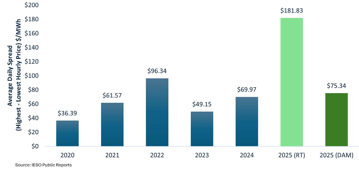 Prices in the real-time market have been significantly more volatile than in the legacy market. The figure below provides the average daily spread between the highest and lowest price hours in the May-to-October timeframe from 2020 to 2025. The average daily spread between the highest and lowest hour real-time price in 2025 was $182/MWh in the first six months of the renewed market — or nearly double the daily spread observed in 2022, the year with the highest spread from 2020 to 2024.[17] It should be noted that 2022 experienced significant volatility in electricity prices due to broader volatility in the commodity markets impacted by the Russian invasion of Ukraine. The daily spread between the highest and lowest price hours in the DAM are higher than four out of the five past years of prices, with 2022 as the exception.