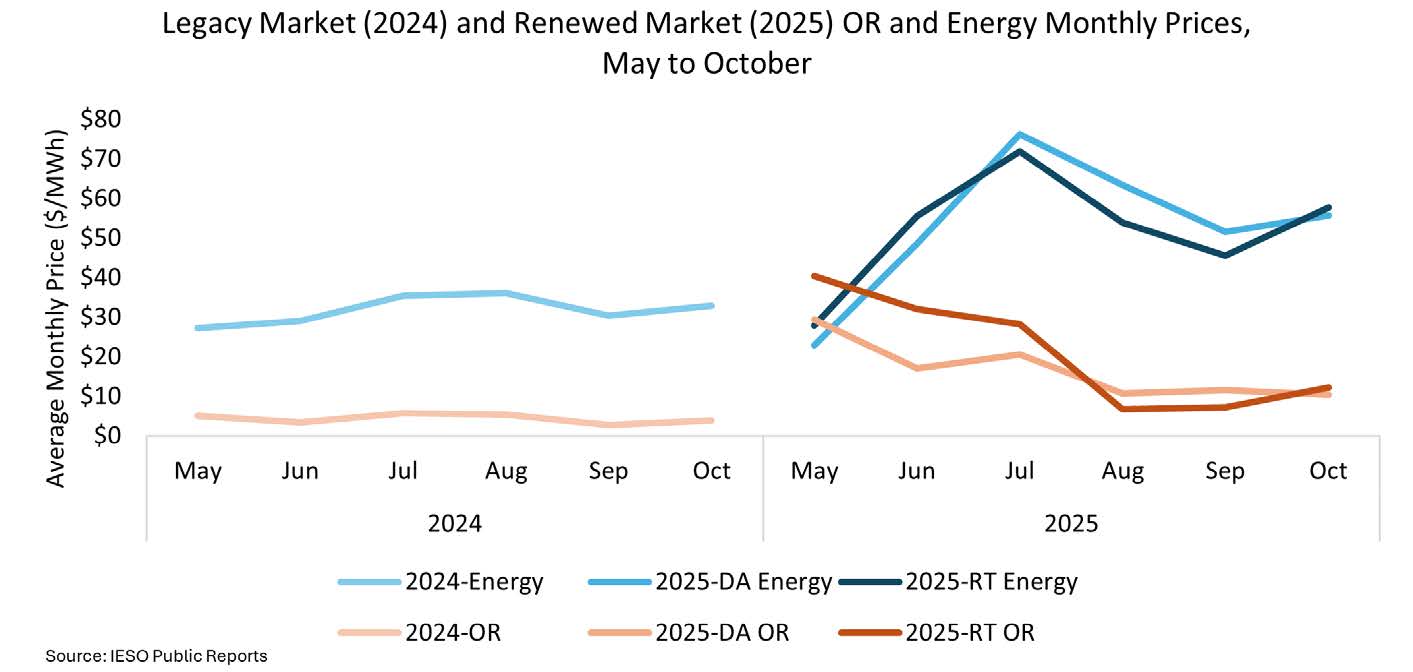 The monthly average energy and OR prices (10-minute spinning) for the May to October period is shown below for both the legacy market in 2024 and the renewed market in 2025.
